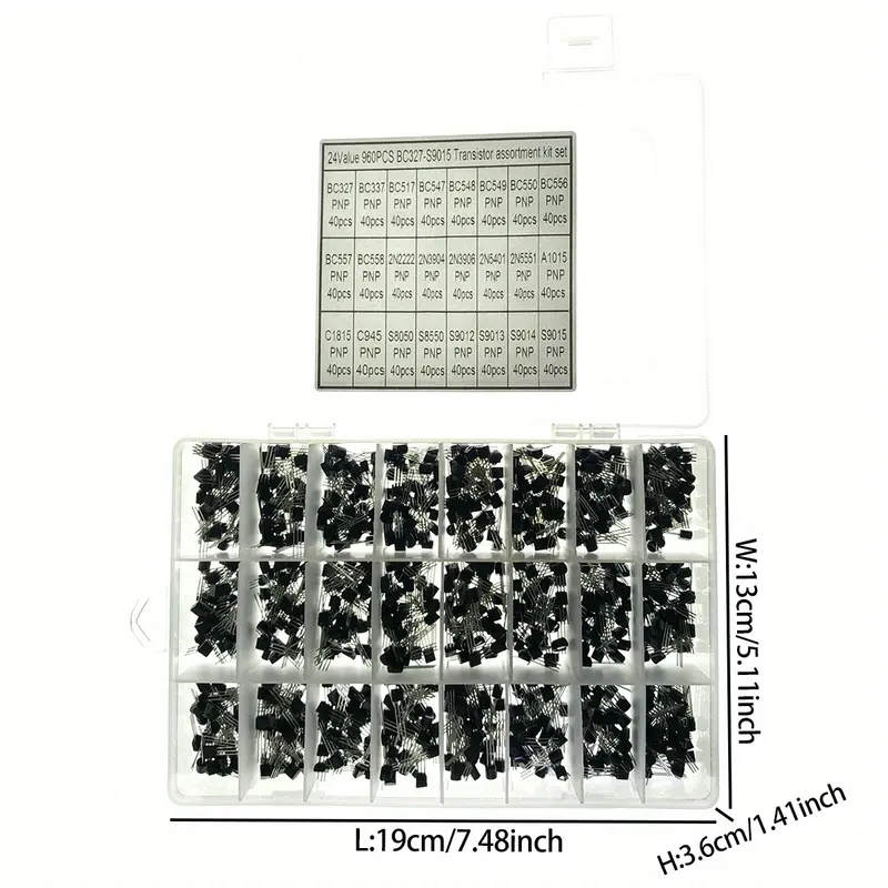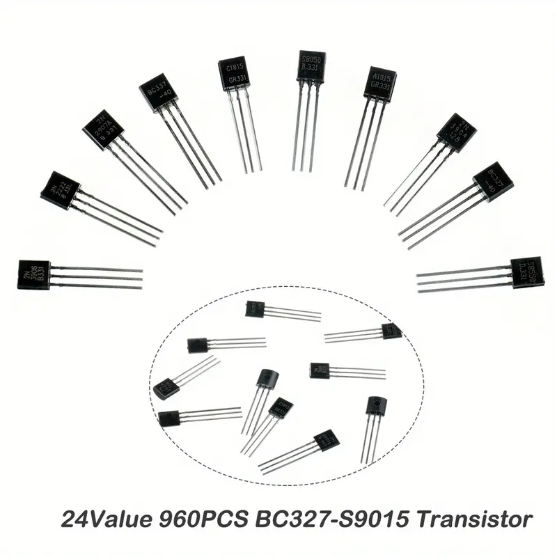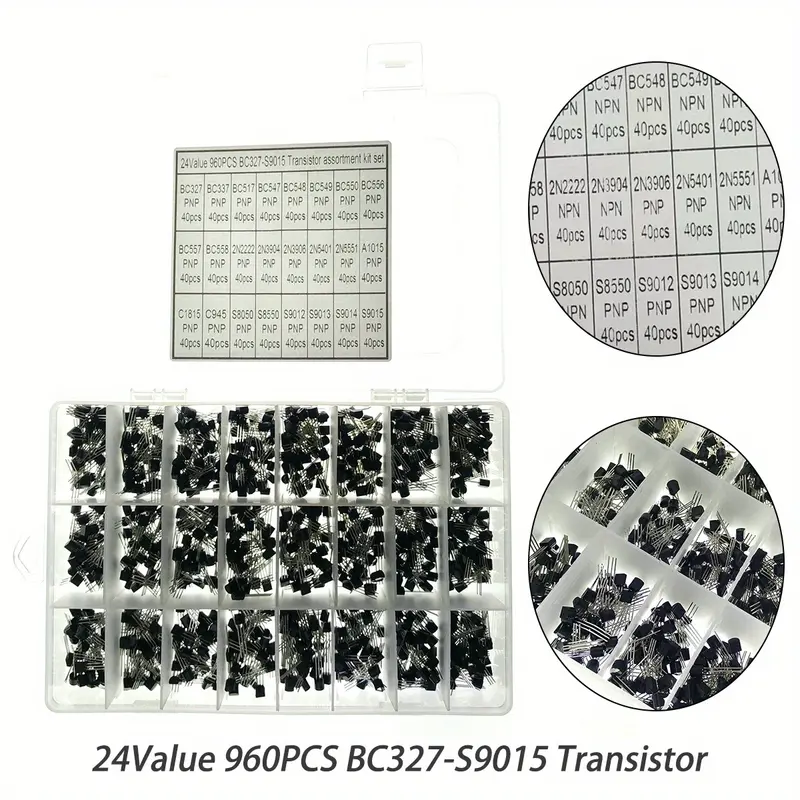 Transistores, 24 tipos NPN y PNP, BC327-S9015, BC558, BC549, 2N2222, 2N5401, A1015, C1815, S8550 caja de 960 piezas 40 de cada una
